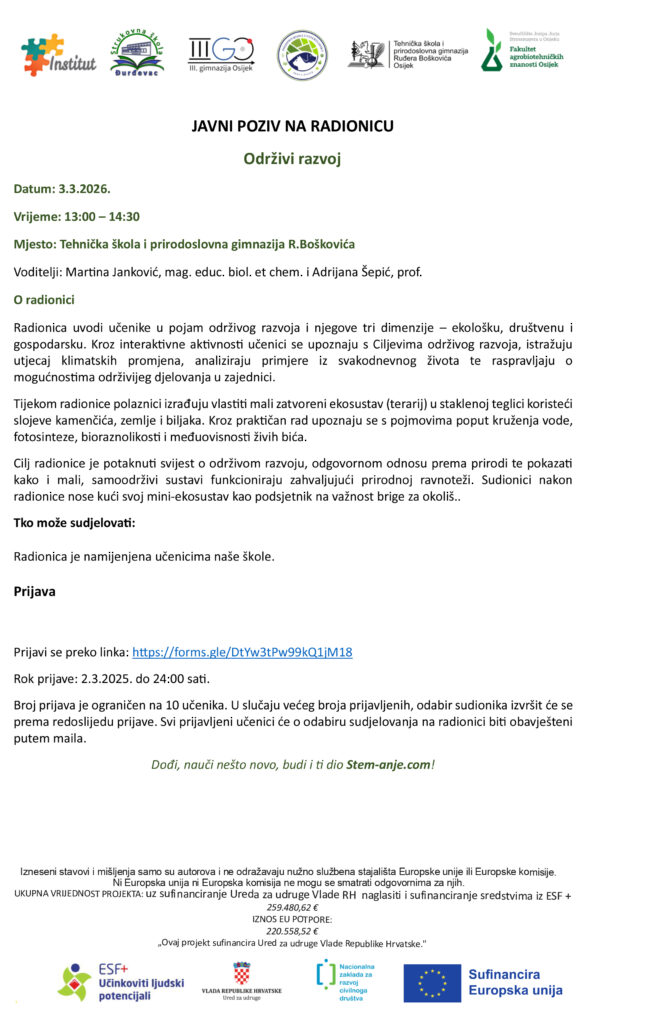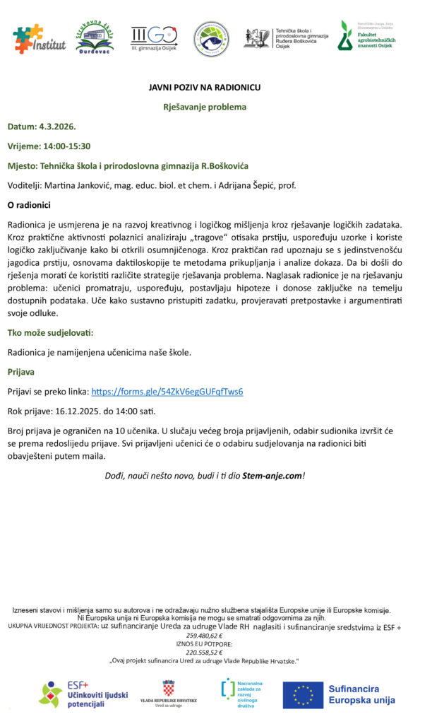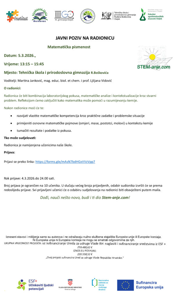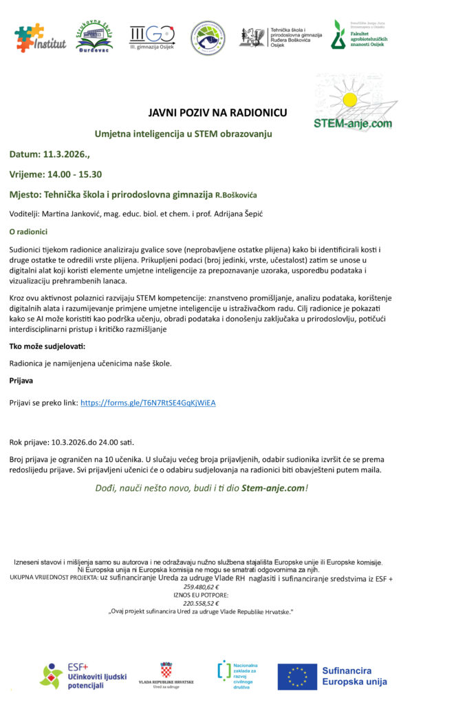 Javni poziv na radionice u ožujkuadmin27/02/2026stemanje, Vijesti Podijeli svoju ljubav Prethodni Objava eTwinning projekt TYMM -Teaching Youth Morality & Mindset Sljedeći Objava Zajedno protiv nasilja: Dan ružičastih majica u školi