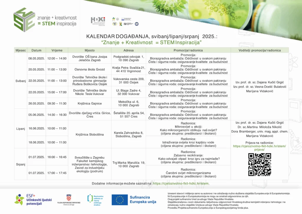 U sklopu projekta “Znanje + Kreativnost = STEM Inspiracija”, tijekom svibnja,lipnja i srpnja 2025. godine održat će se niz promotivnih događanja diljem Hrvatske s ciljem popularizacije održivih rješenja u ambalaži i osiguravanja kvalitete vode, sukladno rasporedu prikazanom u kalendaru događanja. Posjetite nas i pridružite se promocijama koje povezuju znanost, kreativnost i održivost! Dodatne informacije možete saznati na: https://lnkd.in/duhAtgGJ.