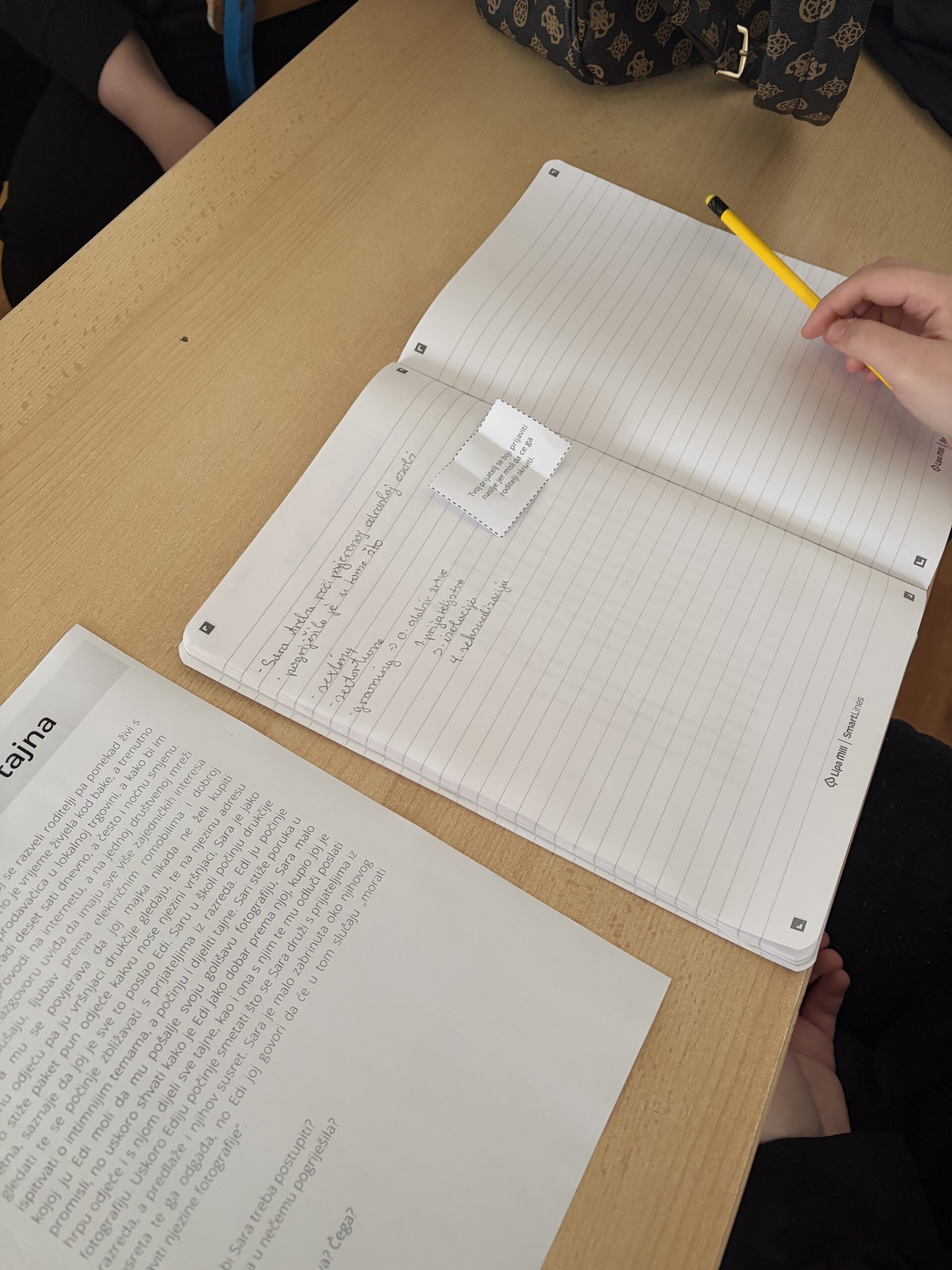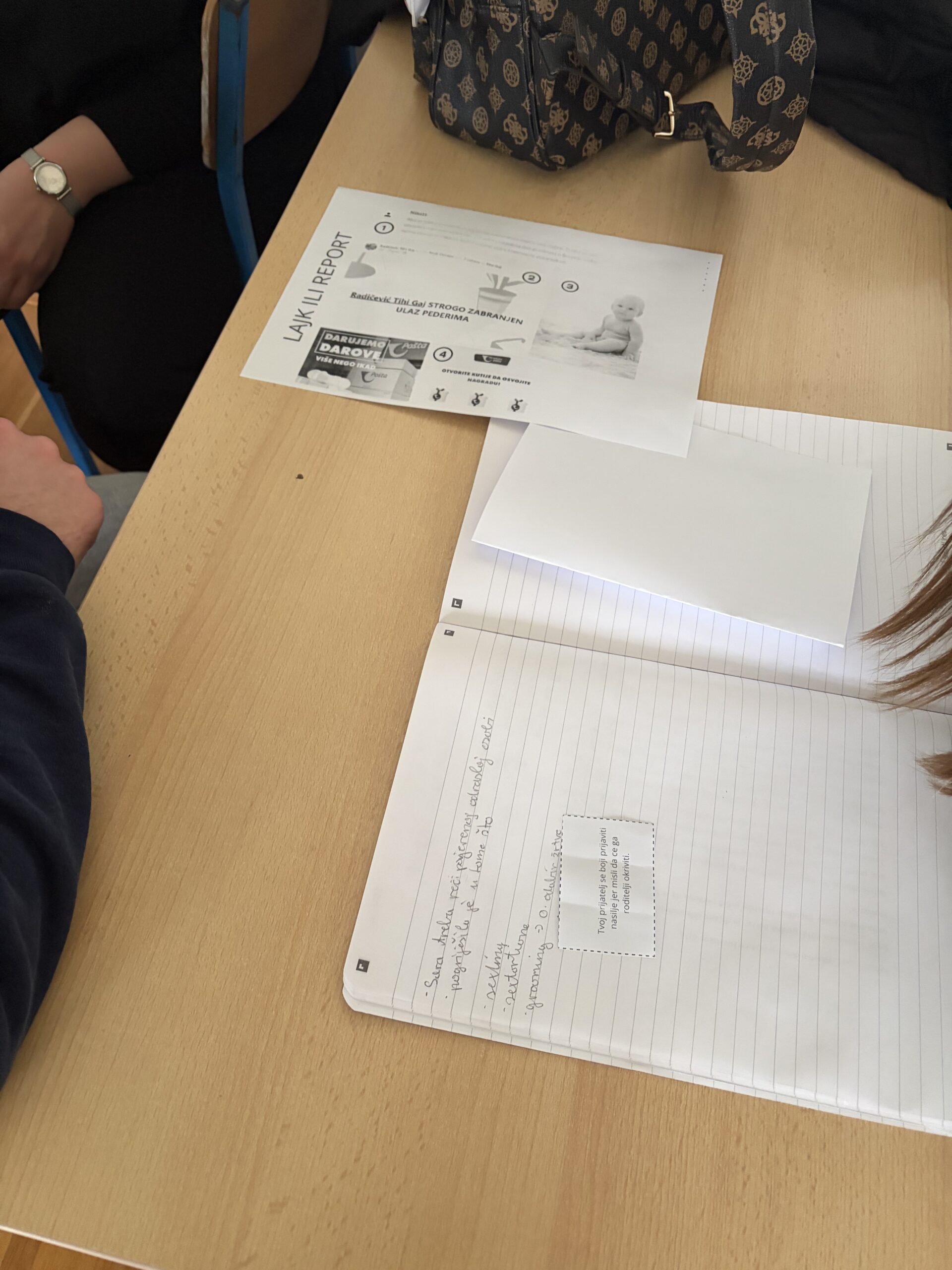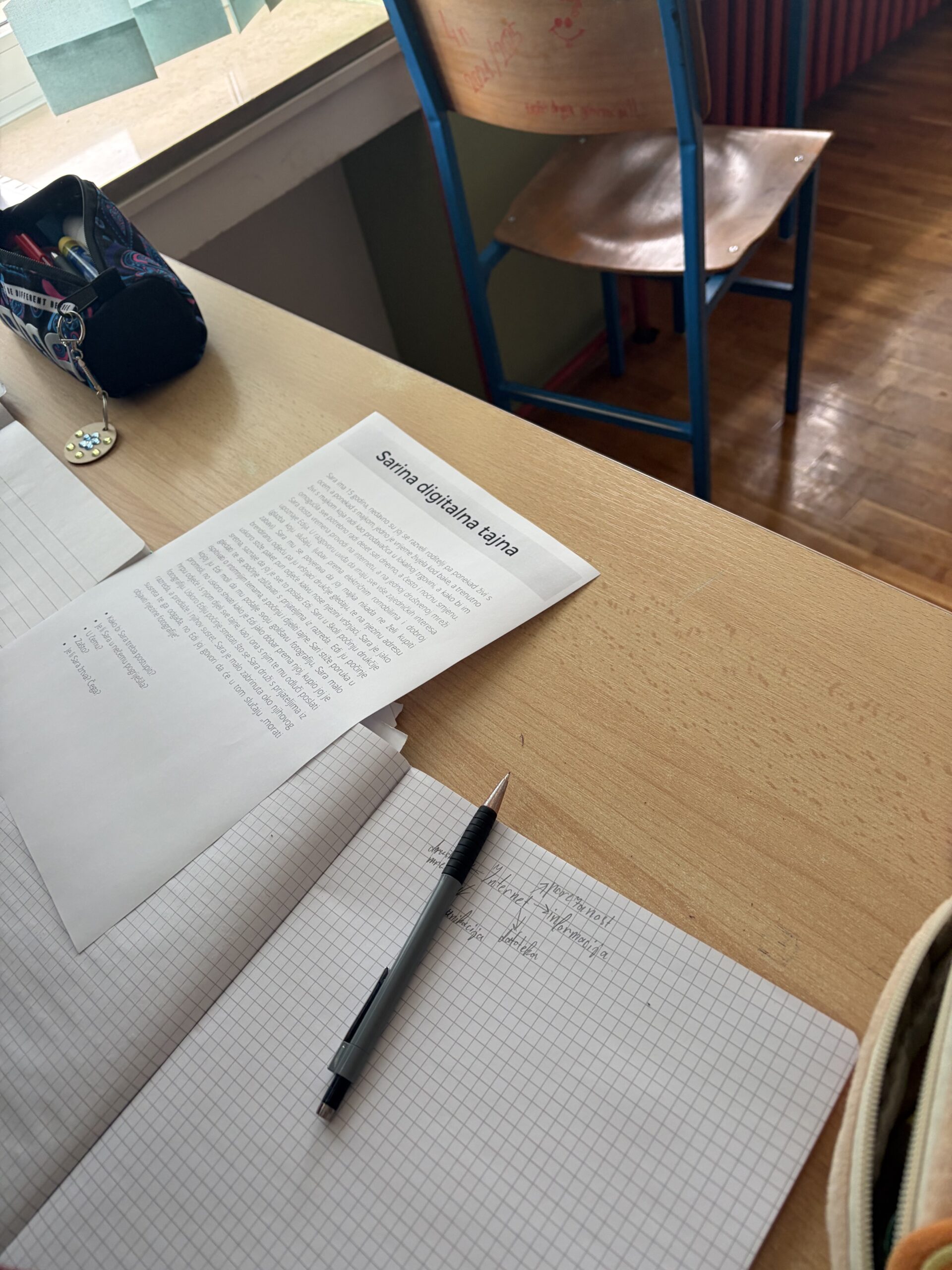 Radionica je započela olujom ideja s pojmom internet, tijekom koje su učenici navodili njegove prednosti, ali i moguće opasnosti, a potom su povezali temu interneta i sigurnosti na internetu s predmetom Etika. U središnjem dijelu sata učenici su analizirali priču „Sarina digitalna tajna“, a vođenom raspravom prepoznavali rizične situacije u kojima se likovi nalaze te postupno dolazili do pojmova sexting, sextortion i grooming. Na primjeru priče uočili su faze vrbovanja, moguće posljedice te načine zaštite i reagiranja u takvim situacijama. Poseban naglasak stavljen je na raspravu o odgovornosti i traženju pomoći. Učenici su prvo promišljali što učiniti kada bi se prijatelj našao u opasnoj online situaciji, a potom igrom uloga uvježbavali kako se obratiti odrasloj osobi za pomoć te kako pružiti podršku prijatelju. Završnom aktivnošću „Lajk ili report?“ učenici su pokazali zrelost, kritičko promišljanje i argumentirano izražavanje stavova. Uspješno su prepoznavali neprimjeren sadržaj, obrazlagali svoje odluke te pokazali razumijevanje važnosti odgovornog postupanja i pravovremene prijave rizičnih situacija u digitalnom okruženju.